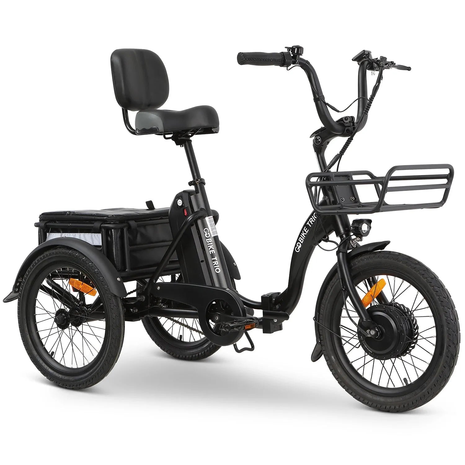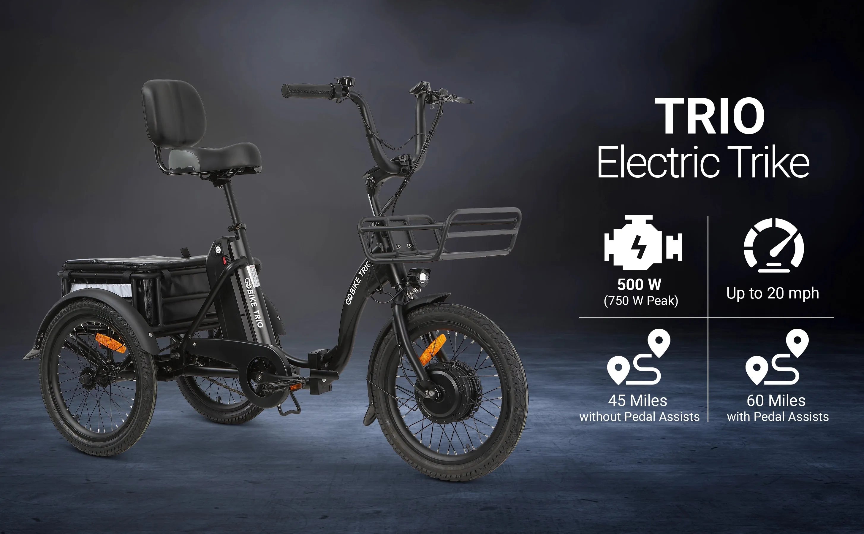 It's simple to get on and off this powerful low step-through electric trike. Our advanced front hydraulic disc brakes provide the greatest stopping power, complemented by the rear coaster brake which requires minimal effort. The tires are capable of handling most surfaces. It comes with optional front and included rear metal baskets, making it a great alternative for both work and play. The GOBIKE TRIO features an adjustable handlebar and a soft seat with a backrest for a more enjoyable ride.