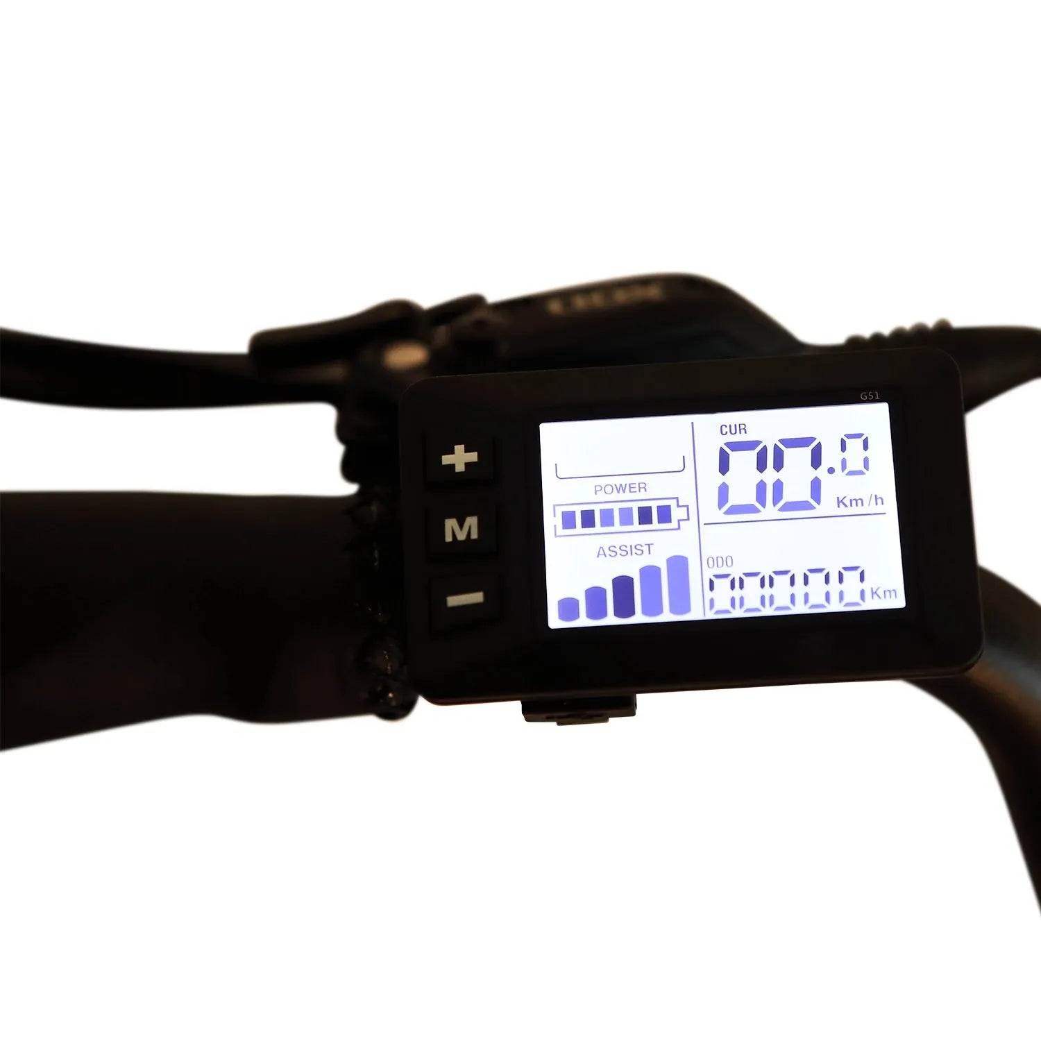 Built solid with a sporty design, it offers up to 60 miles of range with pedal assist, and 45 miles without pedal assist. The 750W motor (peak power) is equipped with all-terrain tires.